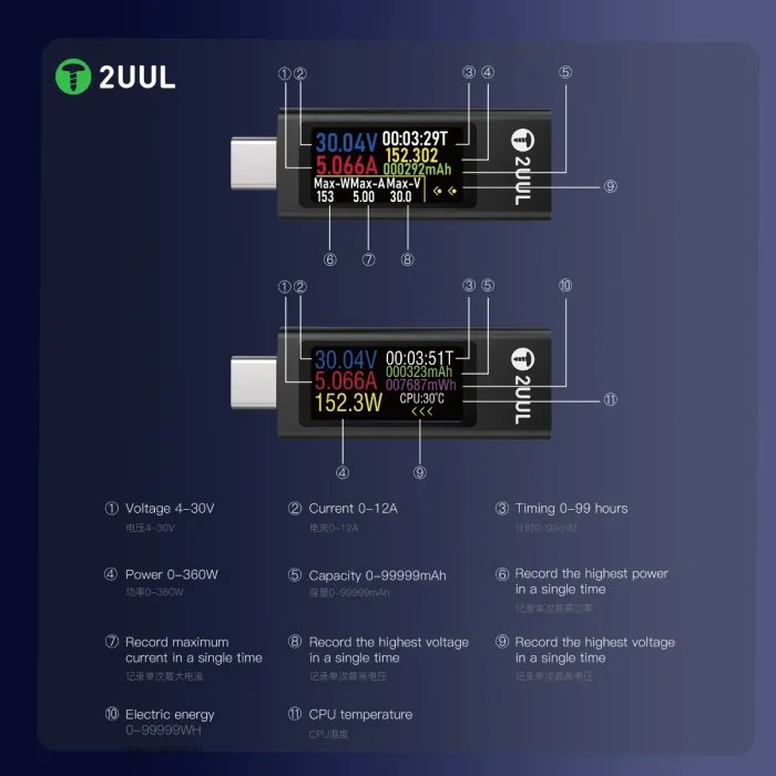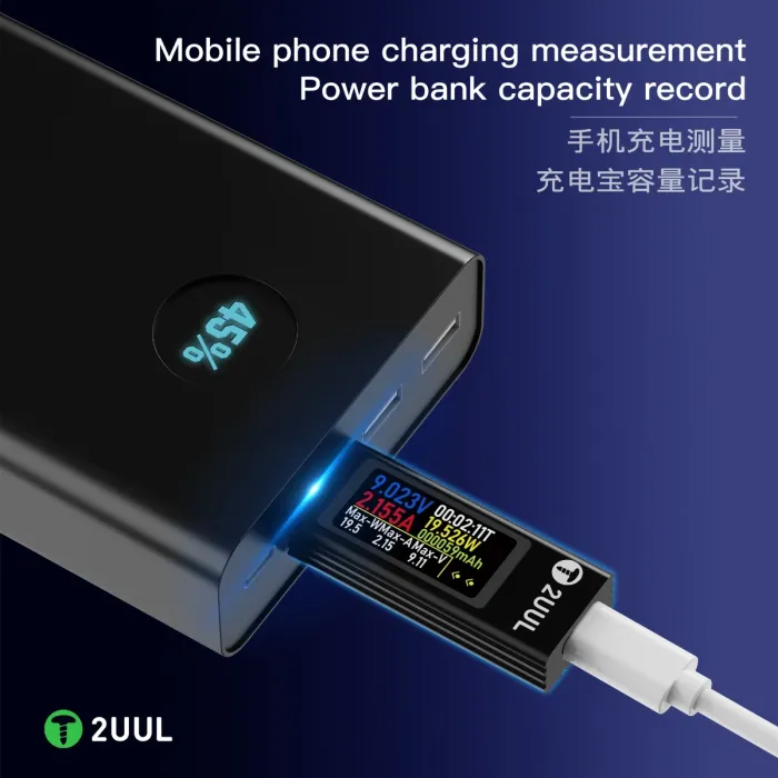 2uul Charging Mate Type-C Mini Charging Detector with Bidirectional Current Test
