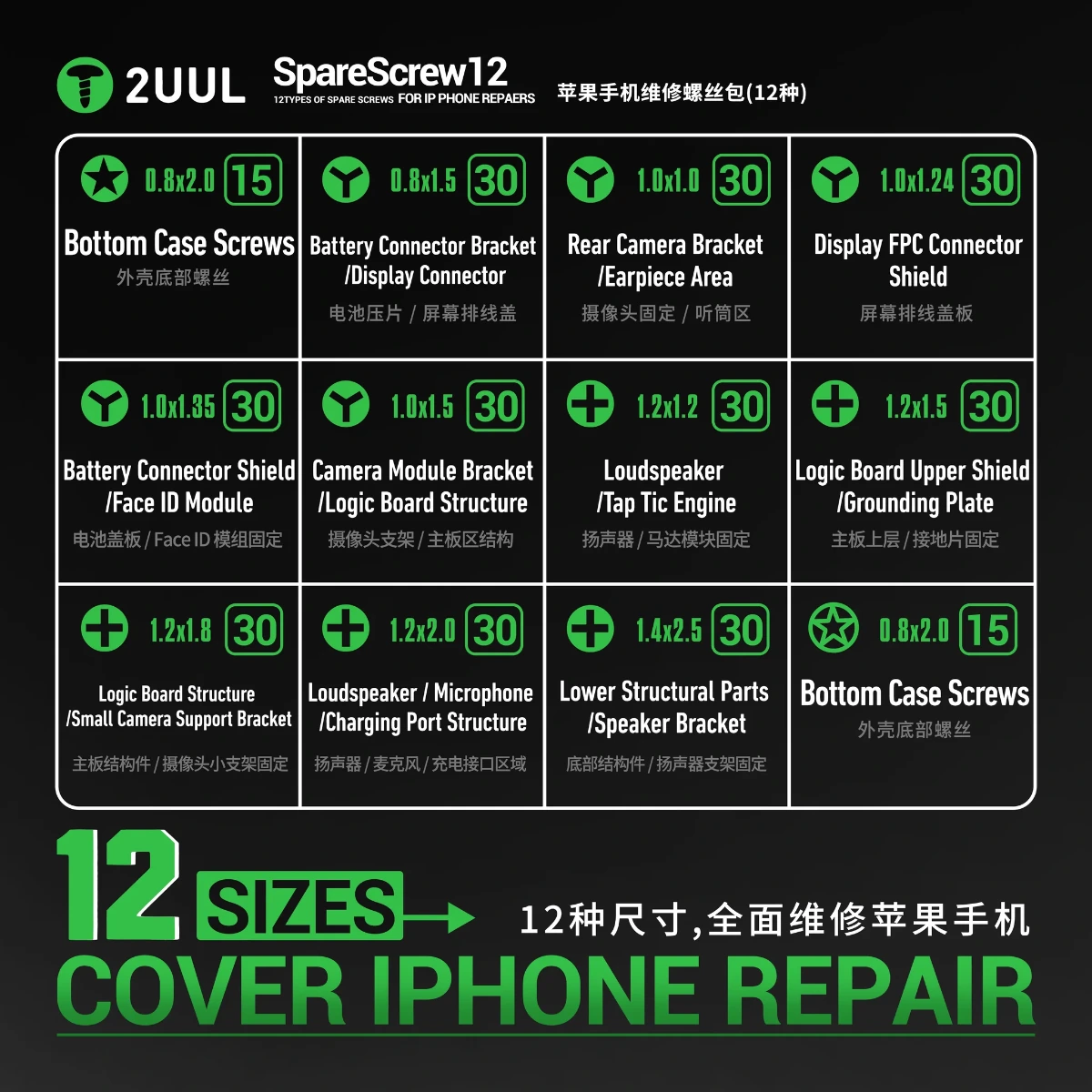 2uul SC22 SpareScrew12 Screws for iPhone Repairs (1200Pcs / Pack)