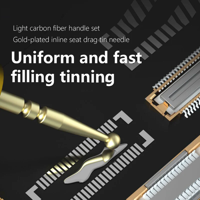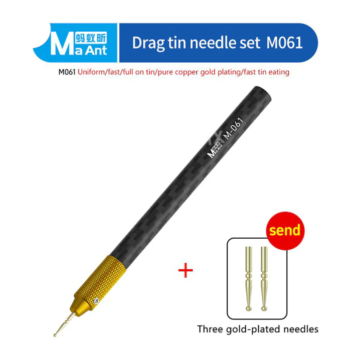 MaAnt M061 Gold-plated Drag Tin Needles with Light Carbon Fiber Handle Set Uniform and Fast Fill Tinning on Electronic/Mobile Phone Motherboard FPC Connectors. MaAnt M061 BGA reballing solder bar gold-plated tin dragging needle with round ball head design, no edges, no scratches, no damage to the PCB FPC connector sockets and motherboard.